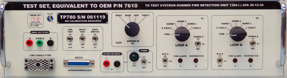 This TP780 is equivalent to OEM P/N 7610. It is used for bench testing, troubleshooting, repair and calibration of the A320 FIRE DETECTION UNIT (FDU), part number 7304-( ), as specified in ATA 26-12-34. TP780 will allow one to perform a manual Functional Test, as detailed in the CMM.