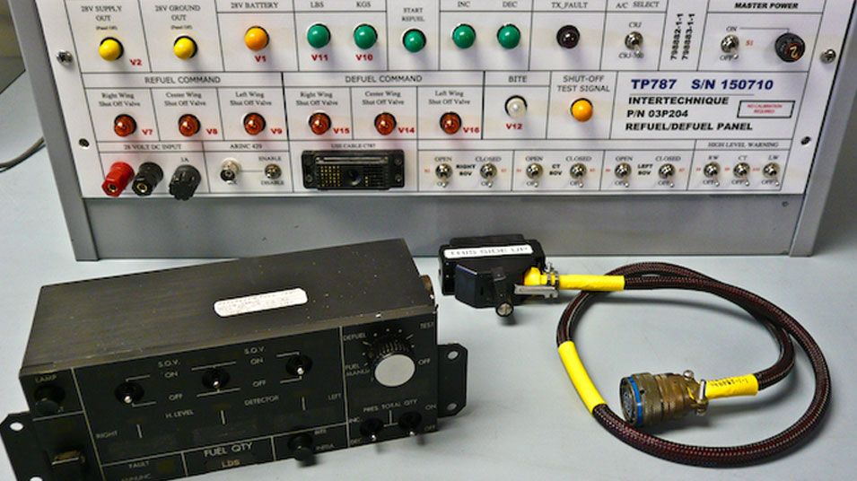 This INTERTECHNIQUE equivalent tester, OEM P/N 03P204, is used for bench testing, troubleshooting, repair and calibration of Canadian Regional jet CRJ-700 REFUEL/DEFUEL PANEL P/N 798882-1-1 and 798883-1-1, as specified in ATA 28-25-18. It is used in conjuction with cable part number C787.