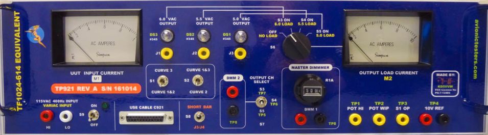 This TP921 Test Panel is equivalent to OEM P/N TF1024-614 in fit, form and function. It is used for bench testing, troubleshooting, repair and calibration of the B737, B747, B777 DIMMER CONTROL UNIT (DCU), P/N 1024-4 Series, as specified in ATA 33-11-14.